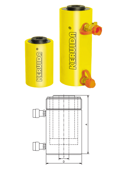 雙作用中空型千斤頂是雙作用過載時進行保護的千斤頂。型號:RRH系列承載能力:30-150 Ton行程:38-257 mm最大工作壓力:70MPa(700Bar)